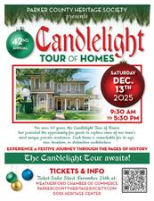 The Parker County Heritage Society’s 42nd Annual Candlelight Tour of Homes is Saturday, December 13th, 9:30 a.m. to 5:30 p.m. Tickets can be purchased online at - parkercountyheritagesociety.com or at the Weatherford Chamber of Commerce. Beginning December 2nd, tickets can also be purchased or picked up at the Doss Heritage Center, 1400 Texas Dr. in Weatherford. Tickets are $20 for Adults and $12 for children 12 and under.