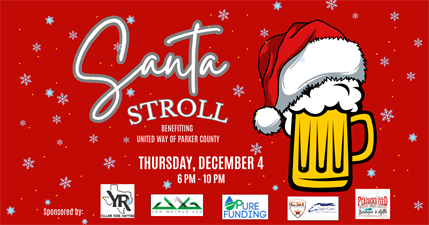 Dust off your Santa suits and get ready to spread some holiday cheer at the Santa Stroll, benefitting United Way of Parker County! This festive event invites participants to dress in their best Santa gear and stroll through local hot spots including Shep's SALT, Zeno's and Antebellum Ale House from 6:00 - 8:30. At 8:30, everyone will gather at Yellow Rose Mapping (110 S Walnut St) for photos with Santa, live Christmas music, games, raffles and a costume contest.